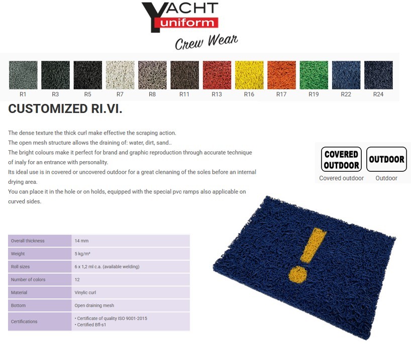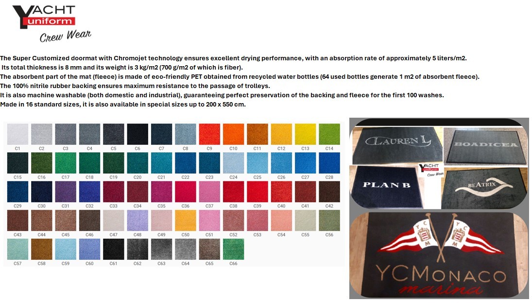 Seguendo precise logiche di produzione, l’azienda mette a disposizione una competenza specifica e specializzata nella fornitura di un’ampia gamma di Tappeti e Asciugapassi, a seconda delle più diverse richieste del cliente. Uno dei servizi di Yacht Uniform è la fornitura di Asciugapassi Super Personalizzati HD. Questi prodotti realizzati in polipropilene (100%), spessore 8 millimetri e fondo di gomma nitrilica, sono in grado di assicurare massima resistenza nel tempo e una pratica lavabilità. Gli Asciugapassi HD vantano una rapida e quasi istantanea asciugatura, con un assorbimento di circa 3 lb/Mq. Tutte le caratteristiche elencate garantiscono un mantenimento al 100% della qualità resistendo al sole e alla salsedine, e permettono un’integrità del prodotto durevole nel tempo.
